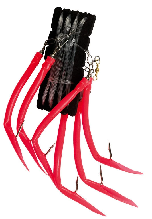 Ein Vorfach von 8,00 m (!) Länge zum effizienten Abfischen (große Strikezone) größerer Wasserschichten und zum Fang von mehreren Köhlern aus einem Großköhlerschwarm. Als Gewicht kommen stabförmige Pilker zwischen 150 g und 500 g zum Einsatz – je nach Tiefe, Drift und Strömung. Sollte ein Makk-Haken mal stumpf sein – kein Problem! Einfach den alten aus dem Hochleistungswirbel lösen und durch einen scharfen Haken ersetzen.