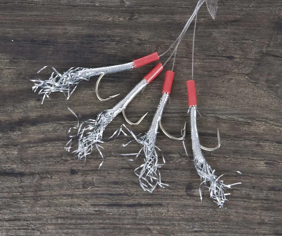 2 Hakengröße 2/0 mit 4 Cristal-Haken, reflektierender Glitterfolie und 0,50mm dicker und 140cm langer Vorfachschnur.