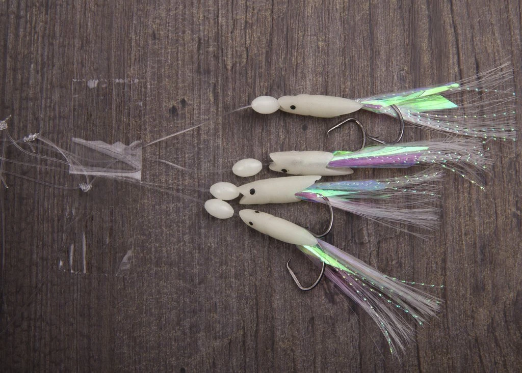 Dieses Makrelenvorfach ist mit vier Circle Hooks, Fluolockperlen, Fischhautimitation, kleinen Mini-Fischchen und Federn ausgestattet.