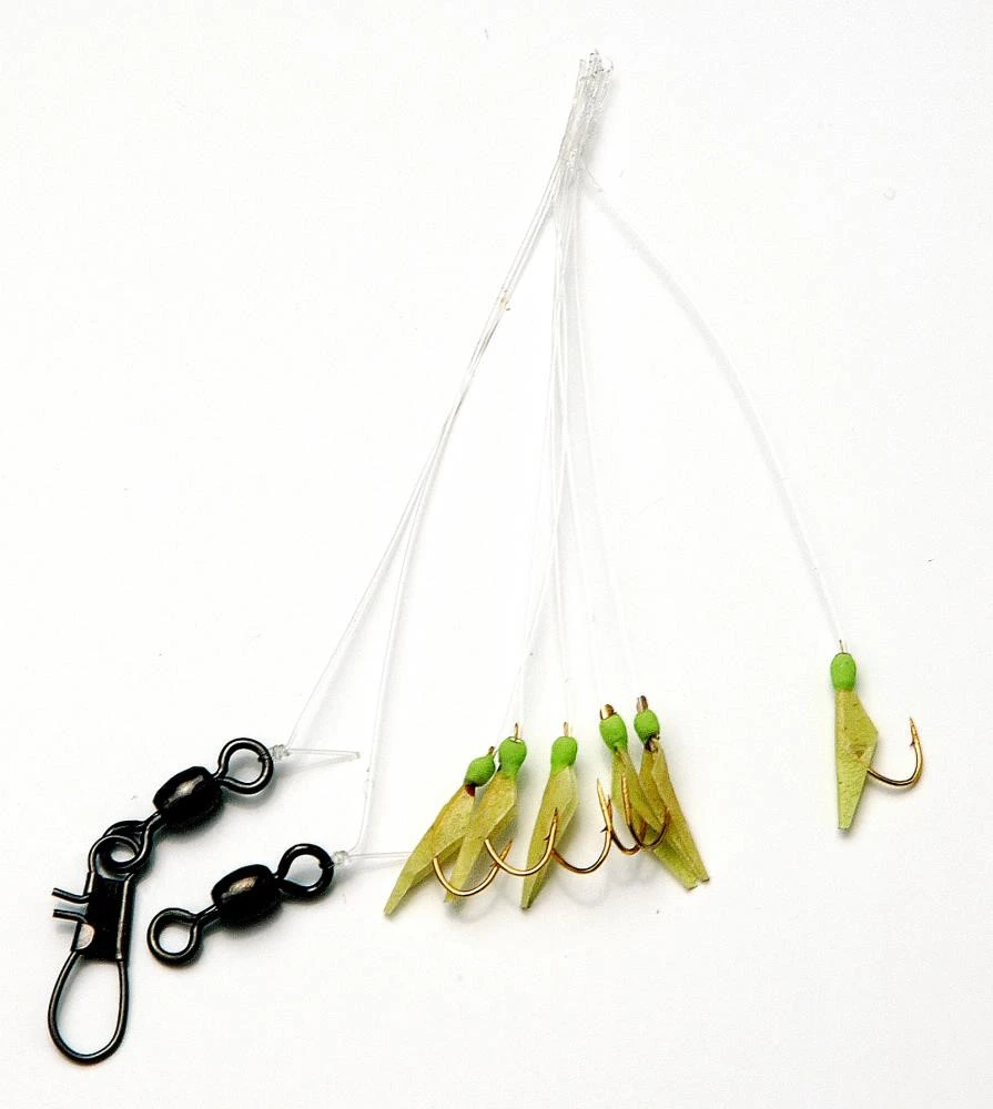 Das ist das ideale System für den Fang von Heringen und Makrelen. Es besitzt 6 Haken der Größe 6 die mit echter selbstleuchtender Fischhaut und Perlen versehen. Angebracht sind sie an einer 0,25mm starken und 6cm langen Mundschnur. Die Hauptschnur hat eine Länge von ca. 1,45m bei einem Durchmesser von 0,30mm.