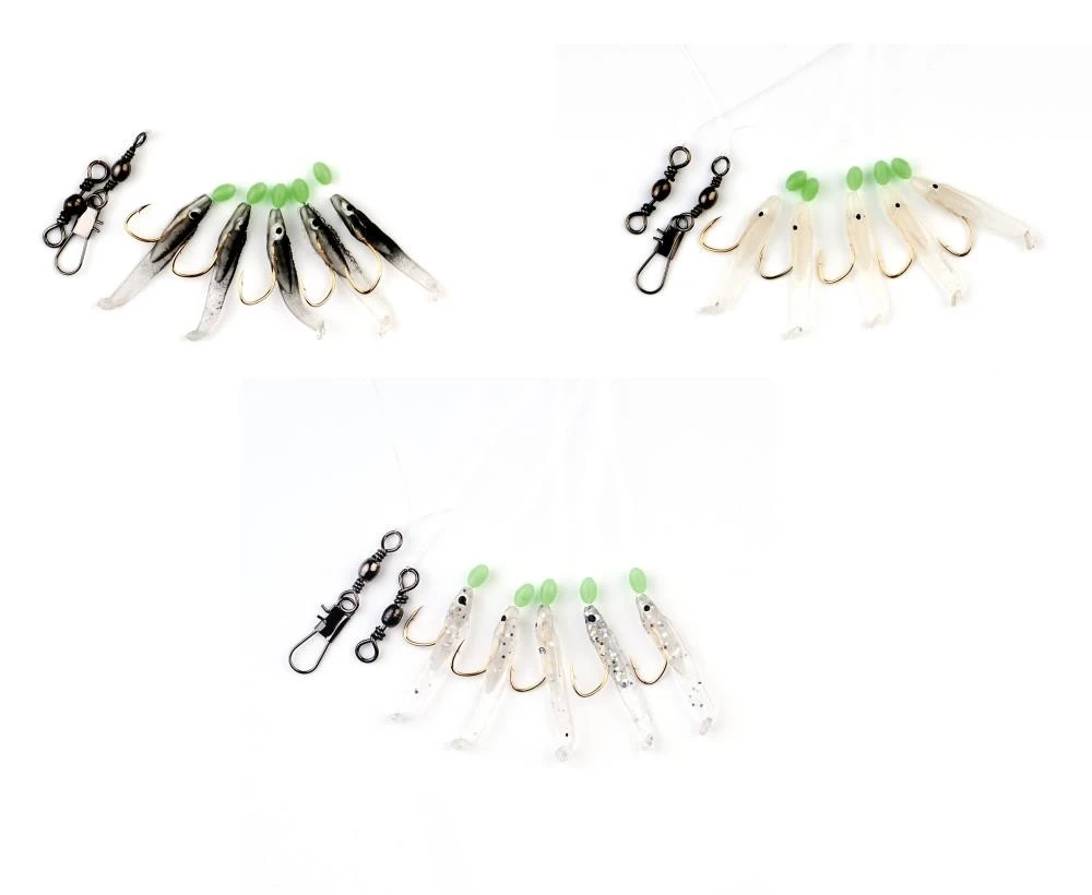 Diese Vorfächer besitzen 5 Haken der Größe 6, an denen kleine Gummifische befestigt sind. Diese sind an einer 6cm langen Mundschnurr mit einem Durchmesser von 0,25mm befestigt. Die Hauptschnur hat eine Stärke von 0,30mm. Die Vorfachlänge beträgt ca. 1,45m.