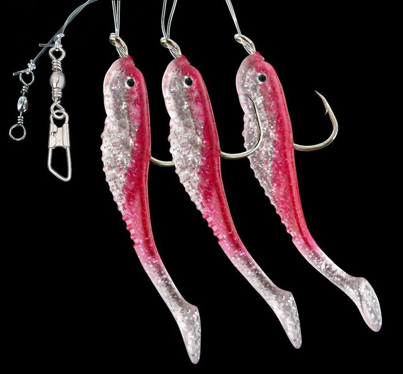 Dieses Vorfach besteht aus drei soften Gummifischen mit Paddelschwanz und inneliegender Reflexfolie. Die Fische sind an 0,80mm starker monofiler Schnur und Haken der Größe 7/0 befestigt.