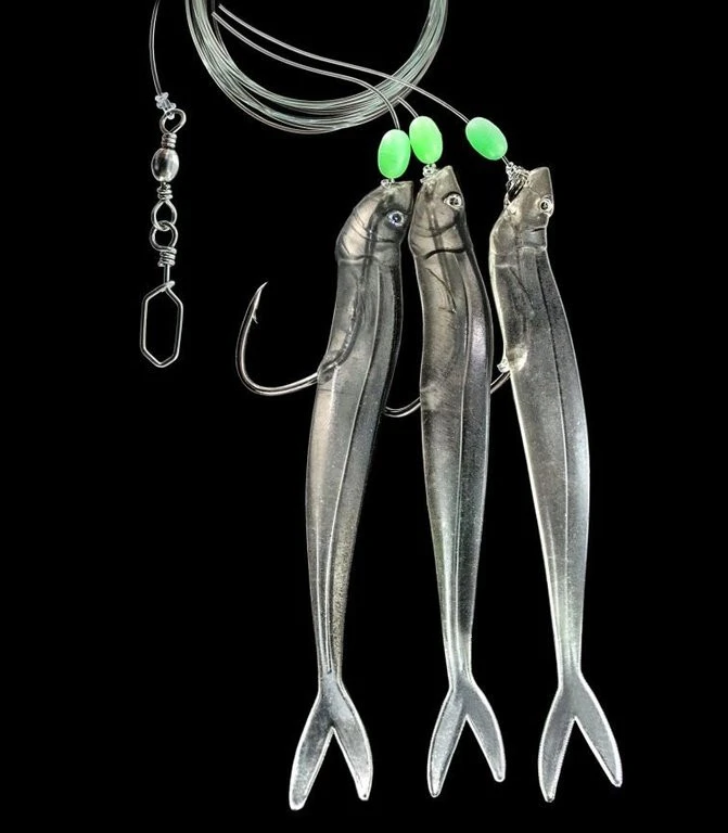 Dieses fängiges Paternoster ist mit drei Gummifisch-Beifängern ausgestattet. Es befindet sich an einer 160cm langen und 1,00mm starken Hauptschnur. Die Seitenarme sind an 0,70mm starker monofilen Schnur befestigt. Die Haken sind kräftigen und haben eine Größe von 4/0.