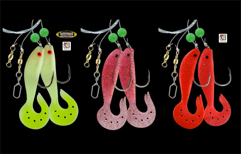 Dieses Pilkvorfach / Norwegen-Paternoster ist mit zwei Gummifisch-Beifänger am kräftigen Haken und Vorfach montiert.