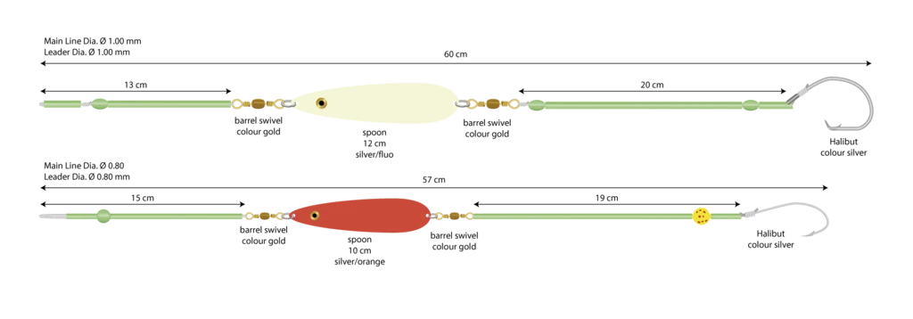 Diese vorgefertigten Rigs sind für das Angeln mit einem Sea Boom geeignet. Empfohlen vor allem für das Angeln auf Lumb und Leng mit Fischfilets und ganzen toten Fischen. Es hat einen Spoon, der die Fische anzieht und sie zum Anbiss verleitet. Das Vorfach ist 57cm bzw. 60cm lang. Die Hauptschnur besteht aus starker 1,00mm dicken Monofilschnur und die Vorfachschnur hat eine Stärke von 0,80mm. Das eine Vorfach hat einen Circle-Hook mit einem 12cm langen Spoon in der Farbe Fluo. Das andere Vorfach besitzt einen normalen Haken und einenr roten Spoon von 10cm Länge. Es sind zwei Systeme enthalten.