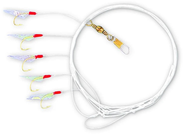Das Vorfach besteht aus fünf goldenen Haken der Größe 6, welche mit echter Fischhaut verziert sind.